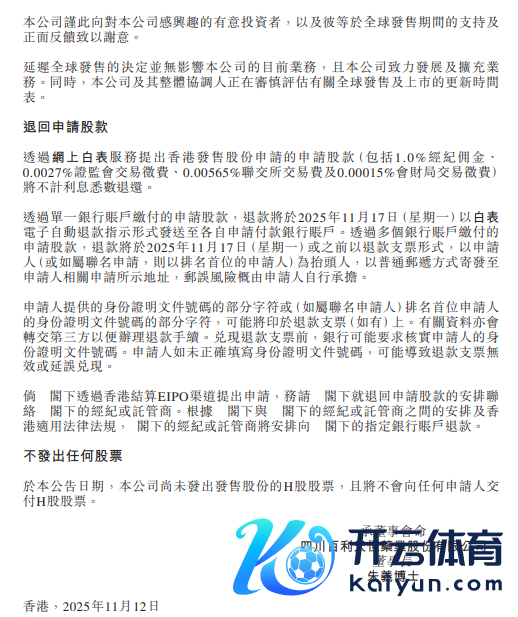 11月12日音问,权略在香港主板上市的百利天恒(股份代码:2615.HK),至本日(12日)午间文书九游体育app娱乐,决定延长其各人发售权略及在港上市时刻表。 笔据公司公告,这次延长是“鉴于现行市况”,并经盘问举座相助东谈主后作出的决定。原定于11月7日至12日中午进行的公开招股已未必住手,且公司明确暗意“将不会笔据招股端正进行”各人发售。这意味着原权略于11月17日的挂牌上市日程已告放手。 当作延长上市的后续安排,百利天恒文书,扫数公确立售的苦求款项将整个退还,退款安排瞻望于11月17日(