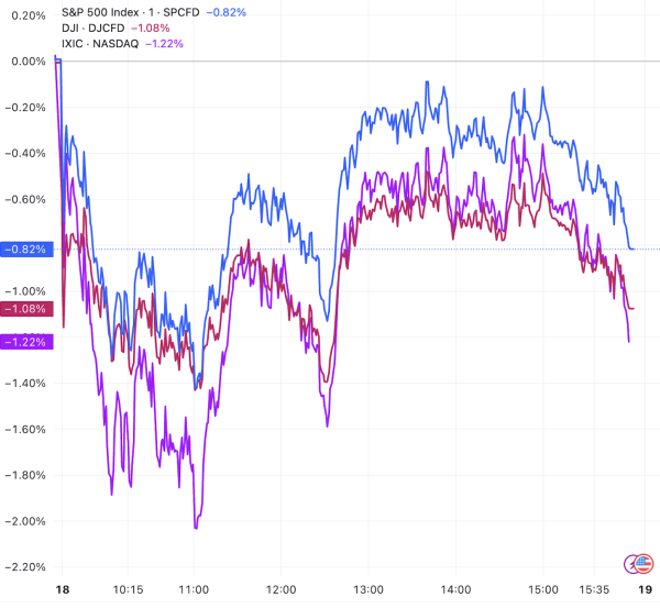 好意思东时分周二,投资者对科技股估值过高的担忧激情持续发酵,三大指数集体收跌九游体育app娱乐,纳指和说念指跌幅均率先1%。 (三大指数日内走势图,开首:TradingView) 为止收盘,说念琼斯指数跌1.07%,报46,091.74点;标普500指数跌0.83%,报6,617.32点;纳斯达克指数跌1.21%,报22,432.85点。 高企的估值以及为配置数据中心而束缚积蓄的债务,使投资者启动质疑东说念主工智能(AI)联系股票的订价。 一项最新访问知道,45%的基金司理合计“AI泡沫”是面