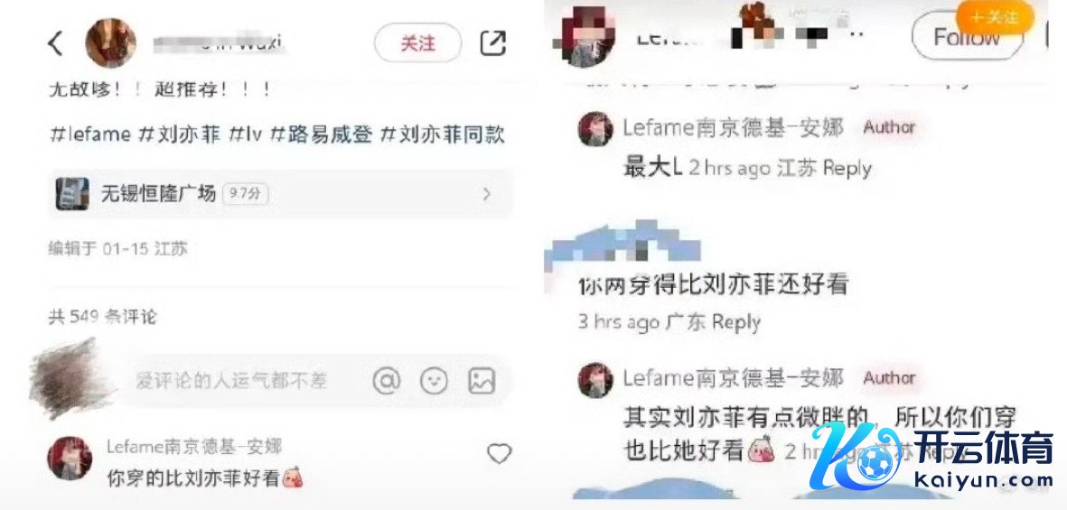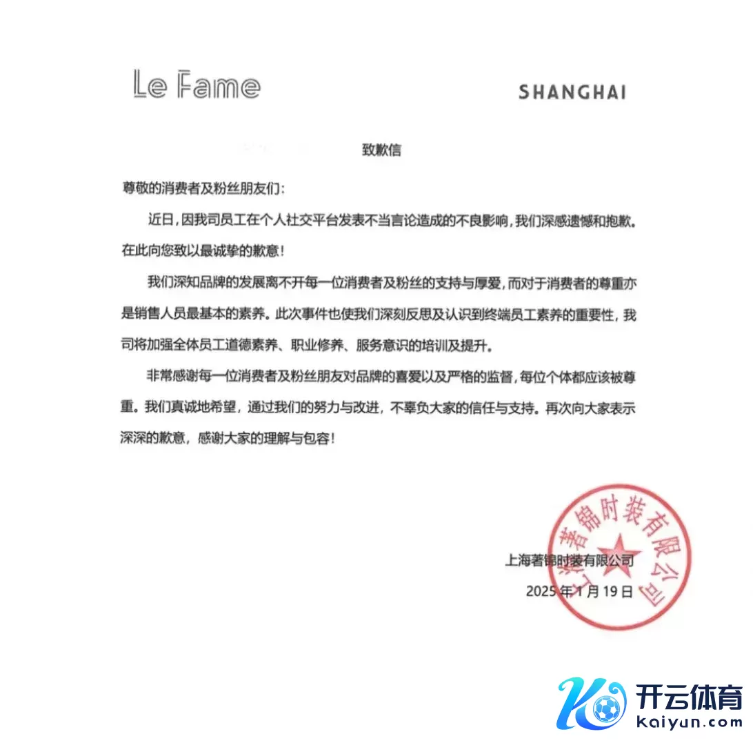 近日,南京德基一柜姐因使用个东谈主应付账号(Lefame南京德基-安娜)发布失当言论被除名一事,引起热议。据应付媒体截图,该柜姐曾磋议网友“你穿的比刘亦菲颜面”“其实刘亦菲有点微胖九游体育app官网,是以你们穿也比她颜面”。 Lefame南京德基-安娜曾发表的磋议。图/应付媒体截图 1月26日,LeFame德基广场店的职责主谈主员谈及柜姐因失当言论被除名时示意,“那位柜姐细则是莫得坏心的,并莫得想谩骂别东谈主,但现形式情仍是发生了,她仍是下野了。” 该职责主谈主员补充,现时店铺为平素运营现象,
