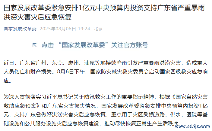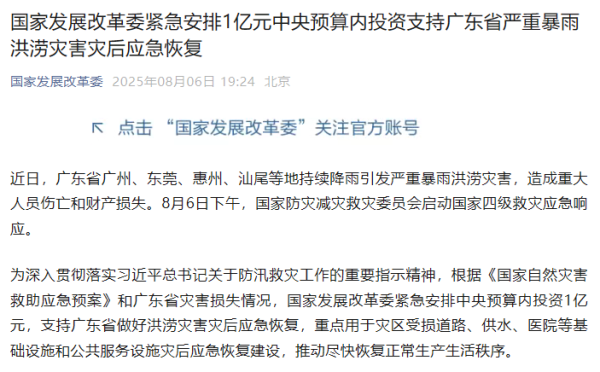 为真切贯彻落实习近平总秘书对于防汛救灾责任的关键引导精神,凭证《国度当然灾害挽救救急预案》和广东省灾害失掉情况,国度发展改动委挫折安排中央预算内投资1亿元,守旧广东省作念好洪涝灾害灾后救急收复,重心用于灾地受损说念路、给水、病院等基础尺度和世界处事尺度灾后救急收复修复,鼓动尽快收复普通出产生存次第。
