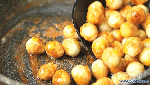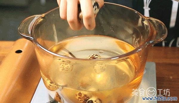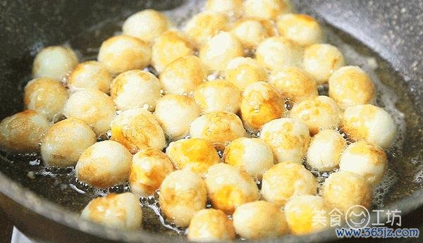 3. 锅中加入油,将鹌鹑蛋煎至名义呈金黄色皋比状。