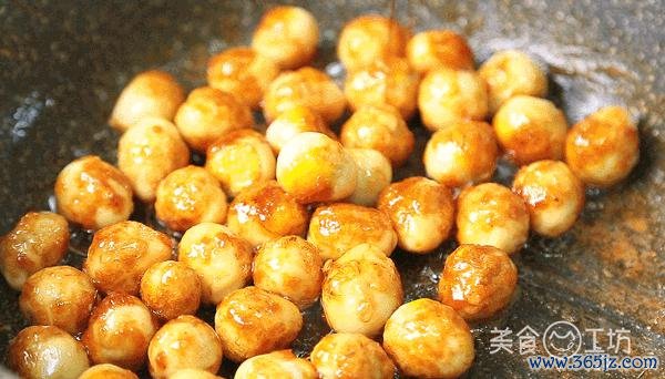 5. 倒入煎好的鹌鹑蛋翻炒。