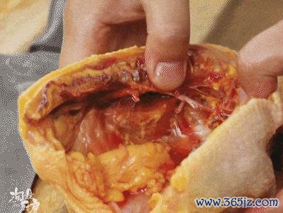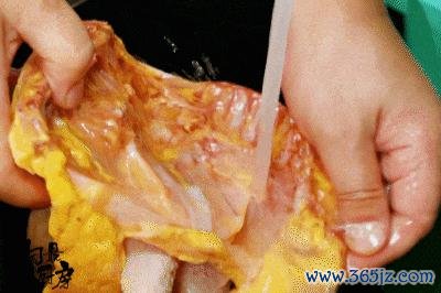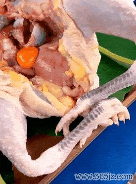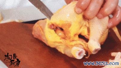 ❶ 从背部剪开:孺子鸡当然化冻后将食谈去除,尾部切去,尽可能从背部剪开。