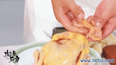 ❷ 鸡油可别丢:切好后清洗孺子鸡,将尾部两片鸡油留住。