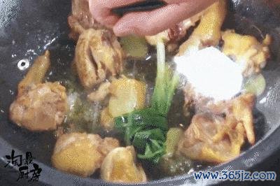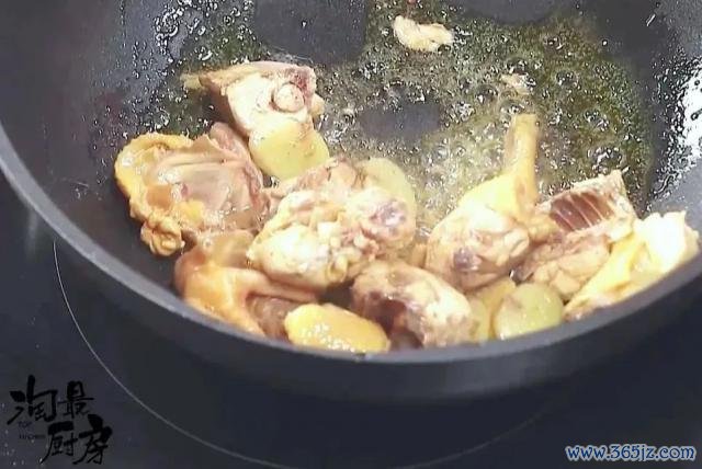 ❷ 放入切好的孺子鸡,煸到名义微微起焦。