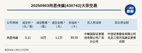每经讯,2025年9月3日,新三板基础层公司尚念念传媒(430743,收盘价:0.06元)发生一笔大量来去,成交价0.11元/股,成交数目10万股,成交金额1.1万元,溢价83.33%。买入交易部是中银国外证券股份有限公司广东分公司,卖出交易部是中信证券股份有限公司北京三里河东路证券交易部。