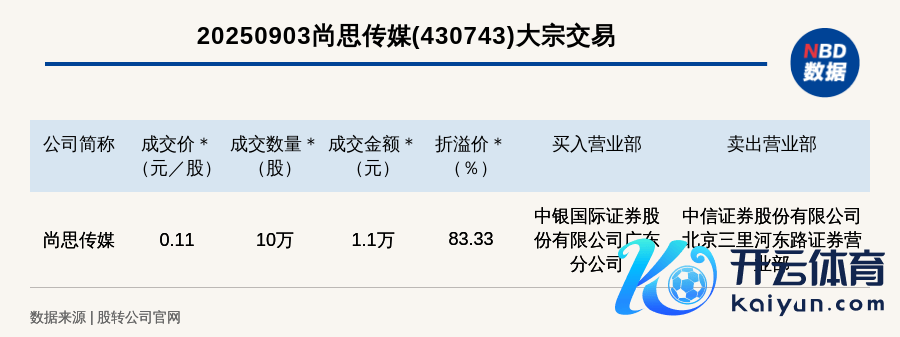 每经讯,2025年9月3日,新三板基础层公司尚念念传媒(430743,收盘价:0.06元)发生一笔大量来去,成交价0.11元/股,成交数目10万股,成交金额1.1万元,溢价83.33%。买入交易部是中银国外证券股份有限公司广东分公司,卖出交易部是中信证券股份有限公司北京三里河东路证券交易部。 (记者曾健辉)现金九游体育app平台