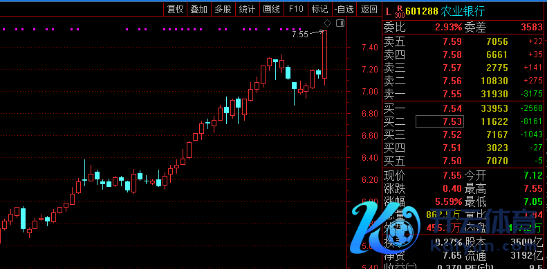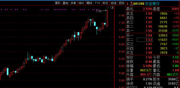 9月4日午后,农业银行捏续拉升,戒指发稿,农业银行A股涨超5%,报7.55元,创历史新高。
