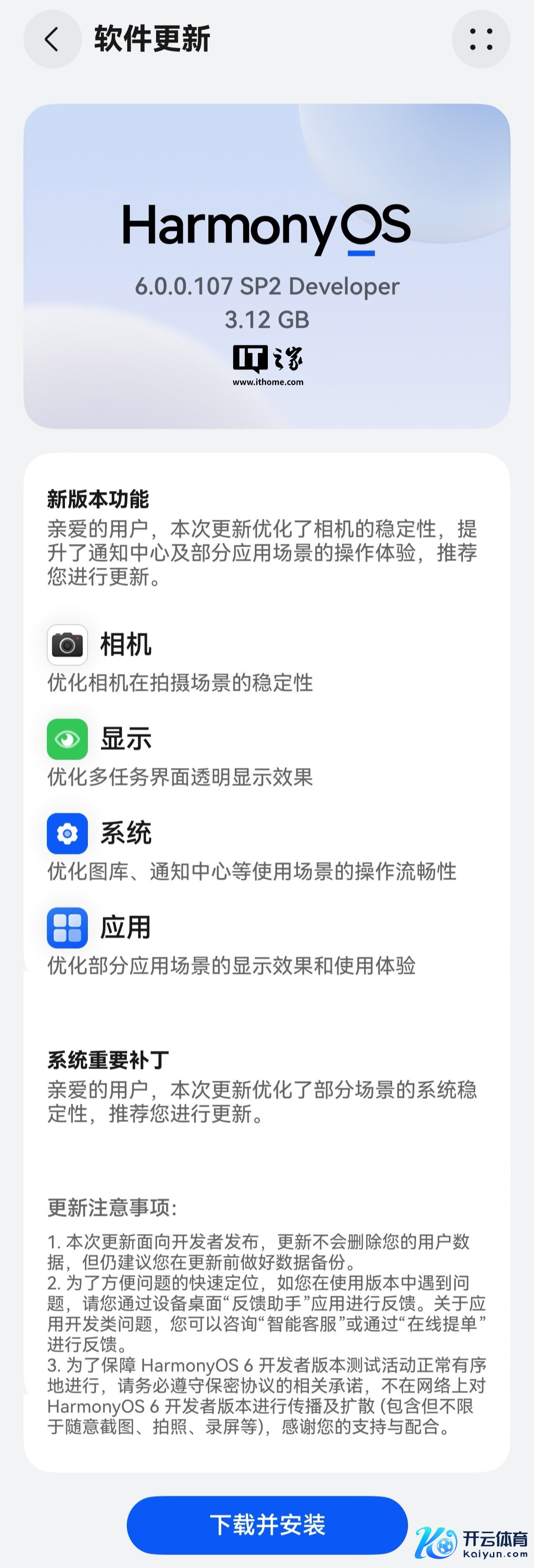 《华为鸿蒙 HarmonyOS 6.0.0.107 SP2 Developer 版块开启推送九游体育app官网,优化相机默契性等》
